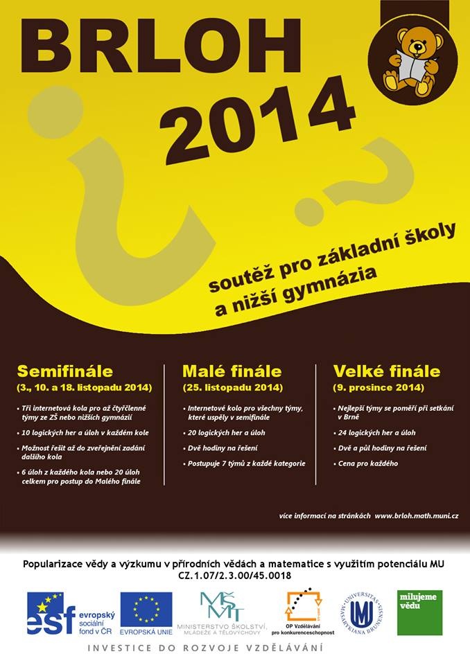 Letos proběhne pátý ročník internetové týmové soutěže, která je určena pro týmy tvořené žáky základních škol a žáky odpovídajících ročníků nižších gymnázií. Každý tým smí mít nejvýše čtyři členy. Týmy je možné registrovat na webových stránkách brloh.math.muni.cz až do 3. 11. 2014, kdy startuje první internetové kolo. Soutěž bude mít tři semifinálová kola, malé internetové finále a velké finále. Každý týden, počínaje 3. listopadem, zveřejní pořadatel na na svých webových stránkách brloh.math.muni.cz zadání 10 logických úloh. Po zaregistrování budou žáci vkládat odpovědi přímo web soutěže. Do malého finále postoupí každý tým, který vyluští v každém kole alespoň 6 úloh, případně 20 a více úloh celkem. Do velkého finále pak postoupí 7 nejlepších týmů ze základních škol a 7 nejlepších týmů z gymnázií. Velké finále se uskuteční v úterý 9. prosince v Brně na půdě Gymnázia tř. Kpt. Jaroše. Pro nejlepší týmy jsou připraveny zajímavé hodnotné ceny.