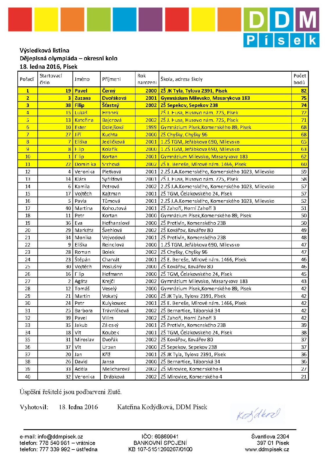 Okresní kolo Dějepisné olympiády, které se konalo v Písku 18. ledna 2016, nám přineslo úspěch v podobě 2. místa Zuzany Dvořákové (sekunda).